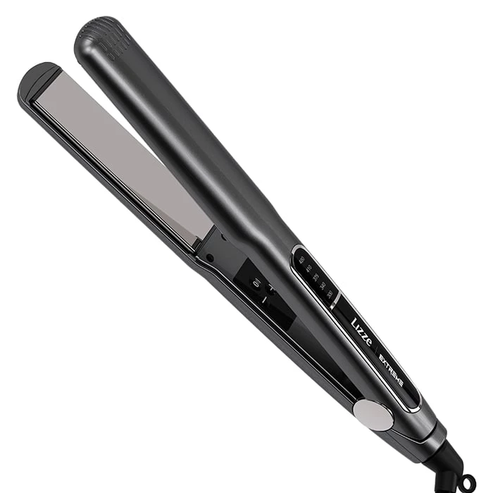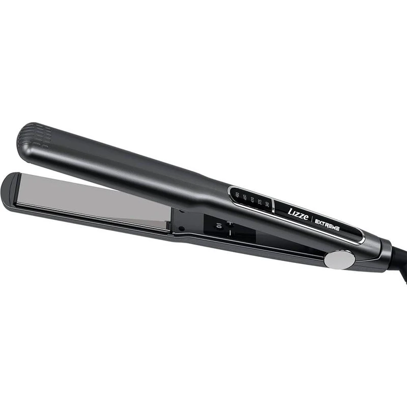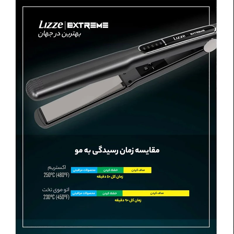 اتو مو لیز مدل Extreme، با صفحات باریک از جنس تیتانیوم، دارای سیستم ایمنی قفل دما، سیم چرخشی 360 درجه ضد گره، نمایشگر دیجیتال، گستره دما بیش از 240 درجه سانتیگراد، به همراه سیم 2 متری