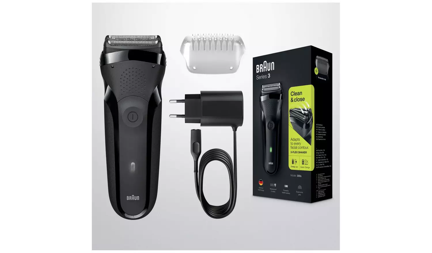 Braun Series 3 S300 با 3 تیغه انعطاف پذیر طراحی شده است که با هر کانتور صورت حرکت می کند تا حداکثر تماس با پوست و کارایی را در یک حرکت انجام دهد. عناصر برش تخصصی حساس به فشار هستند و توسط یک توری فلزی ثبت شده (SensoFoil) برای اصلاح تمیز و نزدیک با راحتی فوق العاده محافظت می شوند. تمامی ریش تراش های سری 3 برای دقت و توجه به جزئیات در آلمان طراحی و مهندسی شده اند.